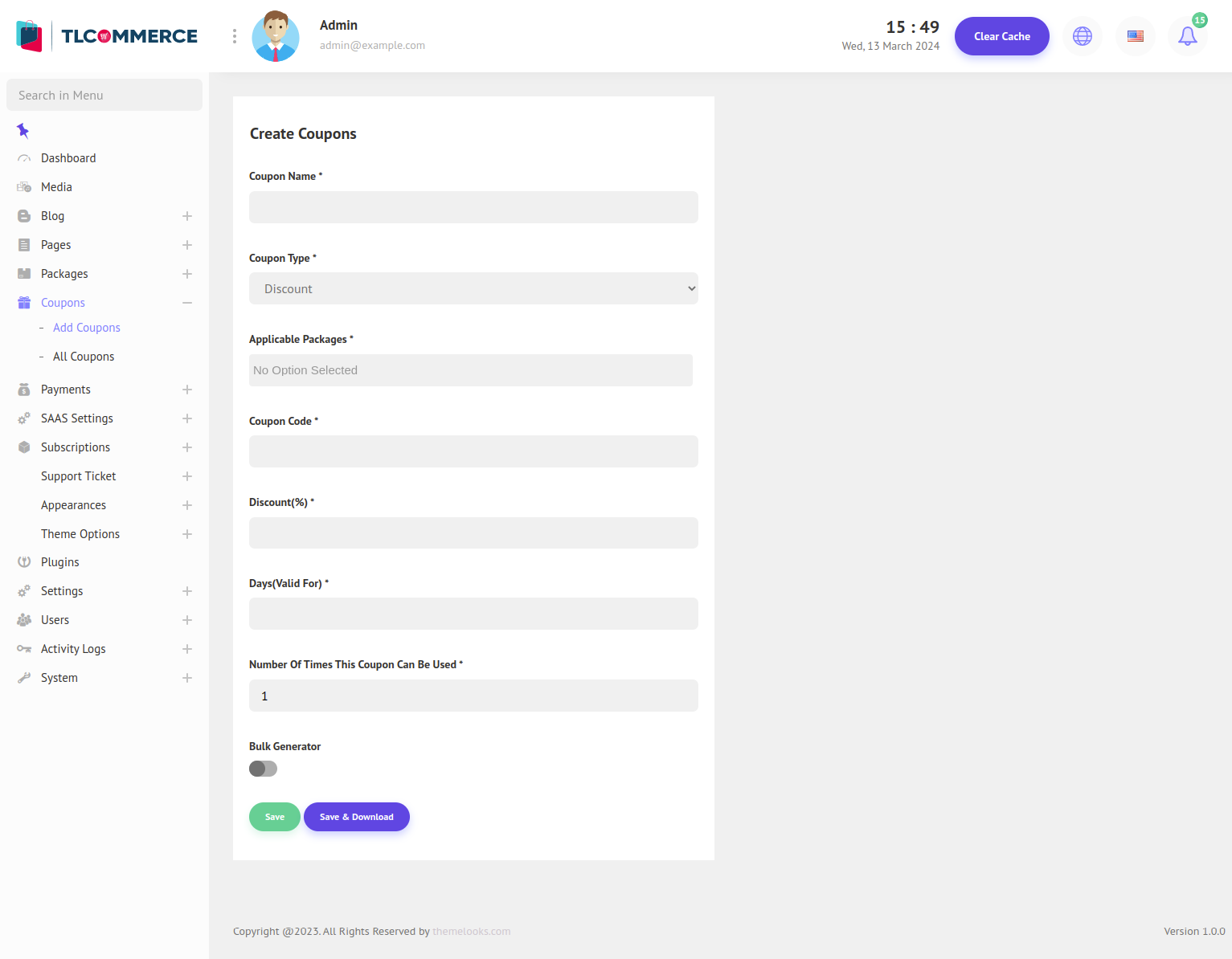 2. Fill up all the necessary details and click the save button ( to create a new coupon) or the save and download button ( to create and download a coupon in CSV format)