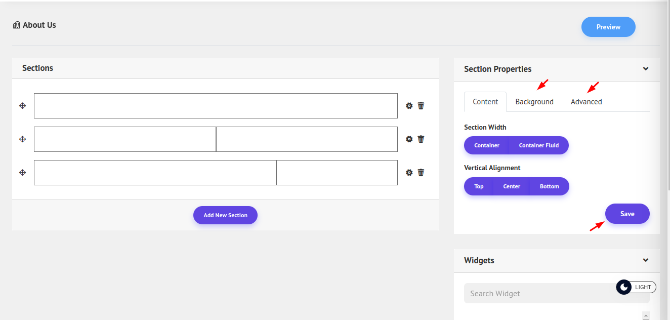 On the right, you can see the section settings properties. In the Content Tab, you can select if the section should be in a container or container fluid. Then The Section content Vertical Alignment.