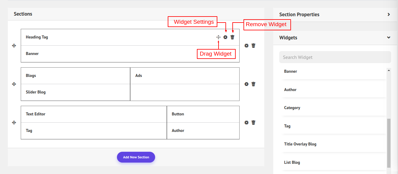 You can also change the widget position on the layouts as well as in the whole section list. Just drag the widget by with the widget drag handler anywhere you want. You can also Remove Widget. And update Widget Settings.