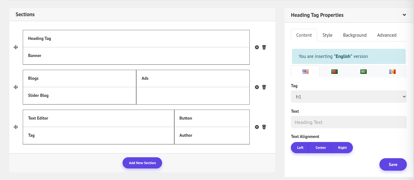 Here for the Header widget, you can see the content tab has a tag and a text field. You can also translate the text into another language. In the Style Tab, you can add some CSS for the widget. And the Background and Advance tab will be the same as the Section settings. They will overwrite the widget default styles.