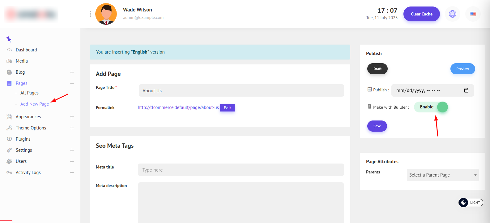 First, the Page Builder Plugin must be active. Then visit Add New Page. And you will find a switcher to make the page builder or default. Give a page title and other necessary fields then click Save.