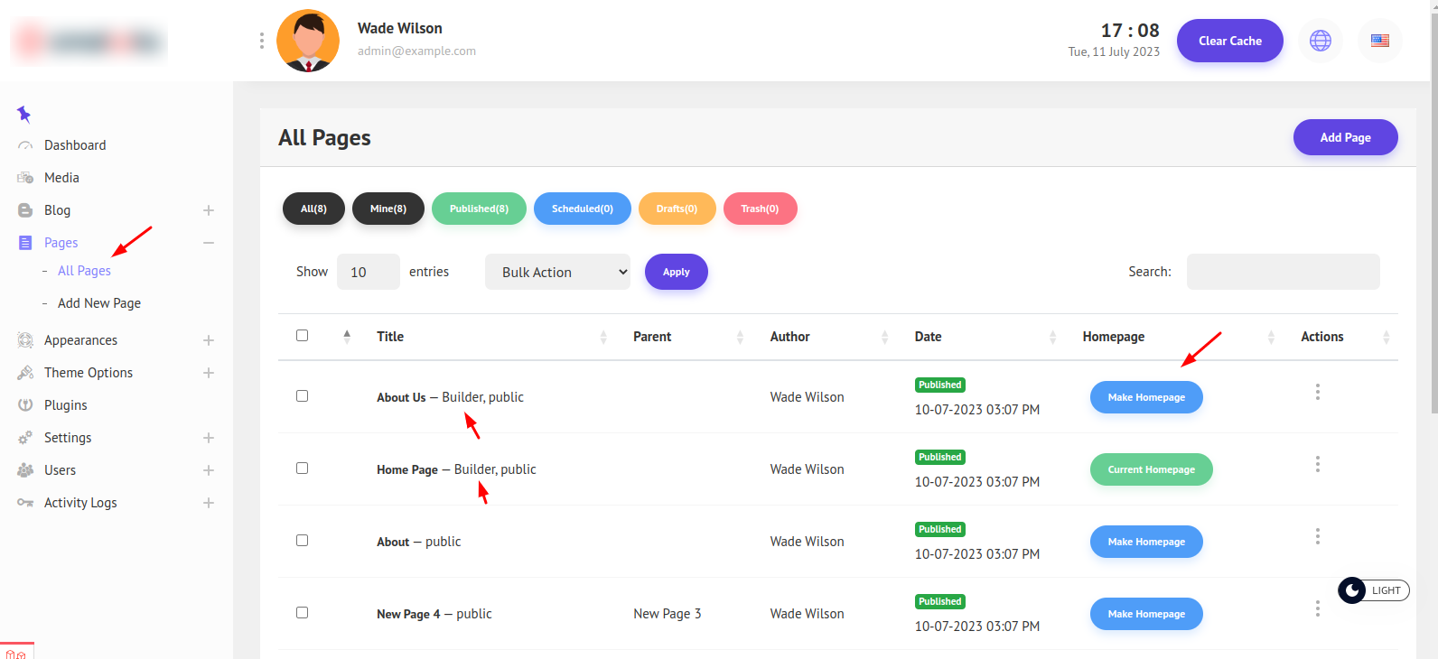 In the page list, you can see an option appeared, Make Homepage. You can now make any page Home Page, If it's made with Builder then the content will come from Builder, or if not then the page content will be the home page content.