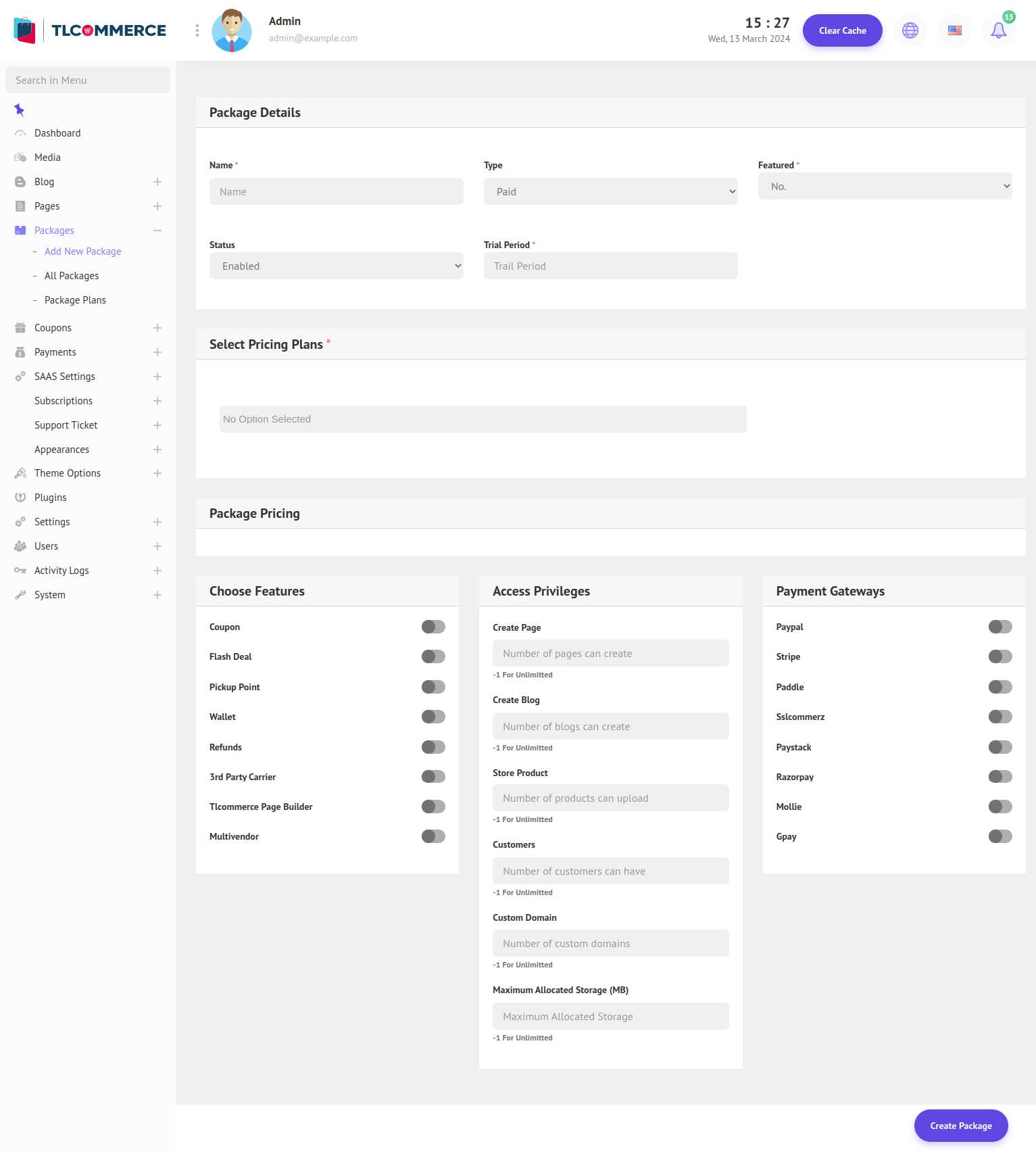 2. In the package adding form fill in all the basic information, select pricing plans, set prices for the plans, add features, access privileges, and payment gateways, and finally click the "Create Package" button to create a package.