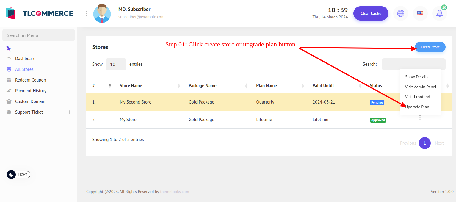 5. Customers can also upgrade their plan by clicking the "Upgrade Plan" button from the action column associated with each row of the store list. Creating store and Upgrading Plan is similar.