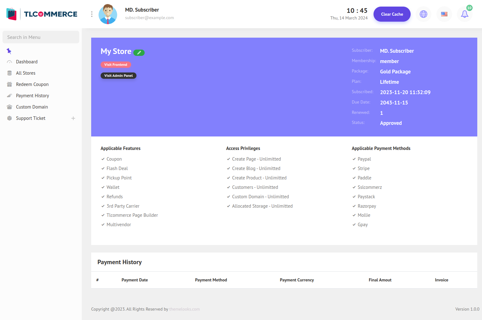 7. Customers can visit the store panel by clicking the "Visit Admin Panel" & "Visit Frontend" button. Always remember that the new store's admin login credentials will be the subscriber panel's login credentials, which they got after registration.