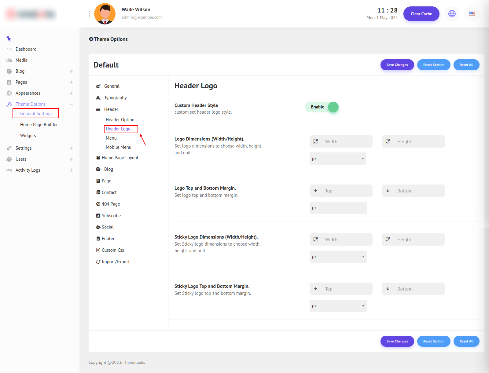 Click Save Changes to save theme options. Click Reset Section to reset only this section. Click Reset All to reset all theme options.