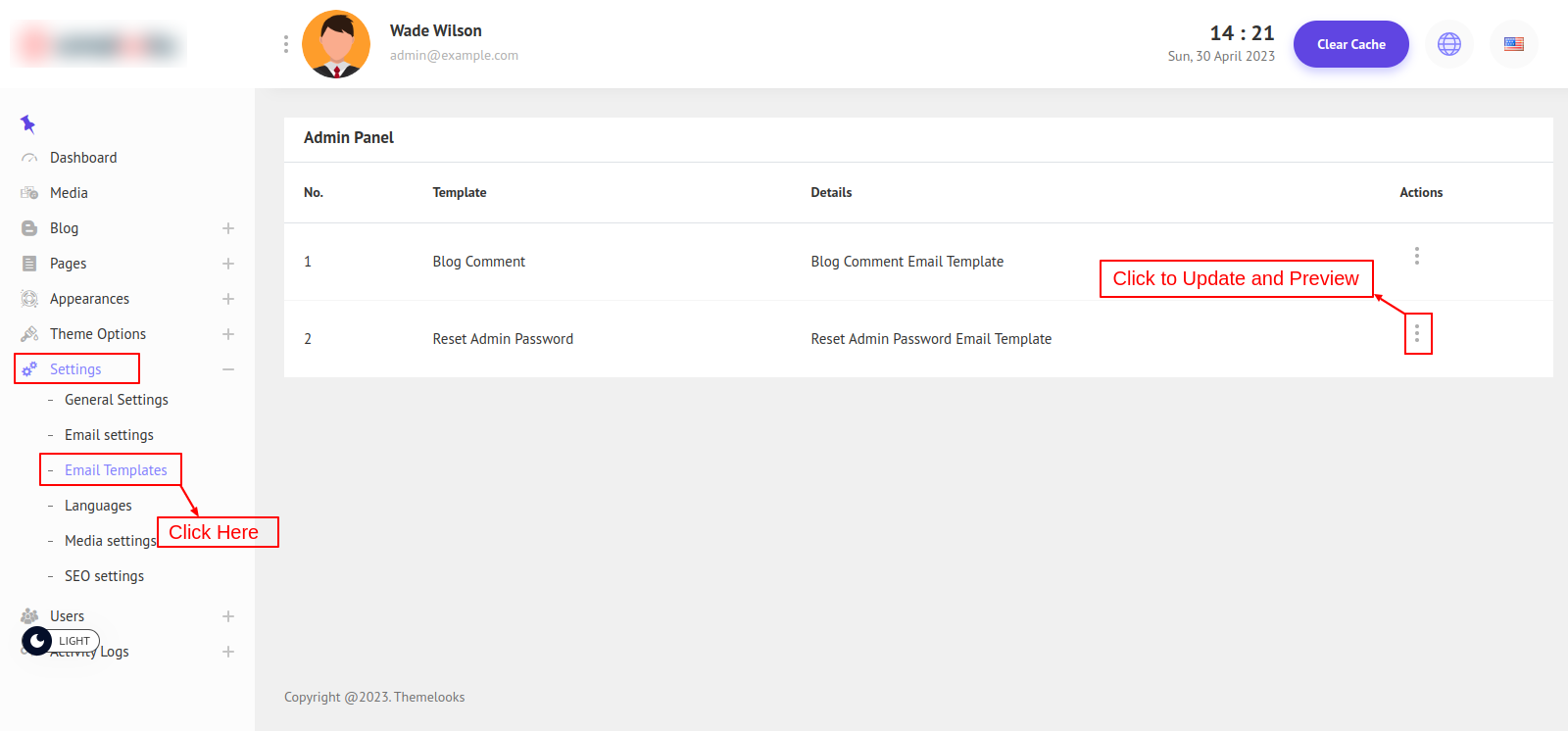 There are many awesome Email Templates available in our system for every notification. But you can also customize them as you want. Now let's see how to do that. Follow Setting > Email Templates, and you will be redirected to the Email templates page.