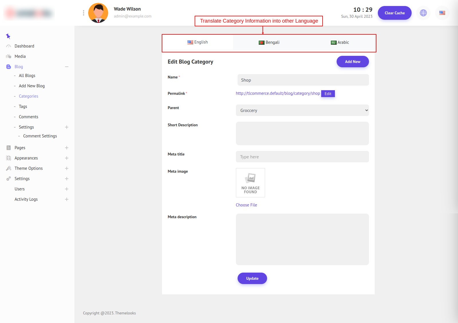 To create a new category click Add Blog Category button and you will be redirected to another page. Here you can give a name and edit the permalink, select a parent, and set SEO information.