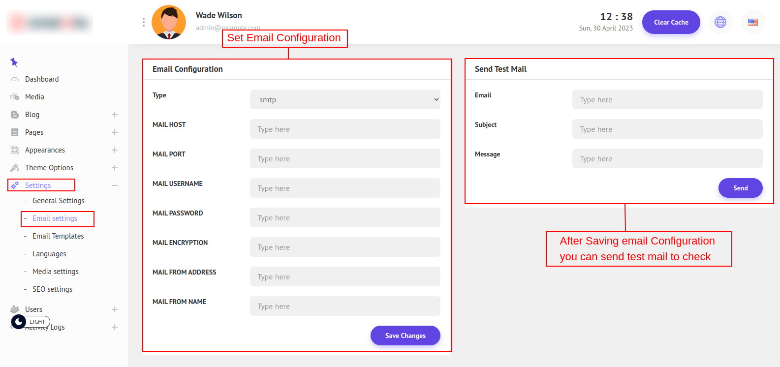 You can select the email type for your email. There are three types SMTP, Sendmail, and Mailgun. Select your preferred type and fill in other configuration fields.