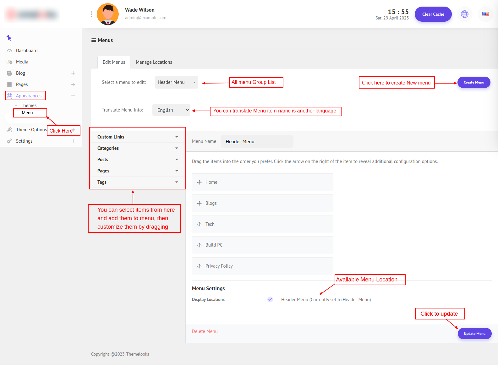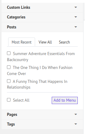 - Select items from the left sidebar and add them to the menu. You can create custom links and add them to the menu. You can also select Blog Categories, Blogs/Posts, Pages, Tags, and Blog tags. You can find them by most recent, view all, and also can search them. Then select one by one or select all then click add to the menu to add them to the selected menu.
