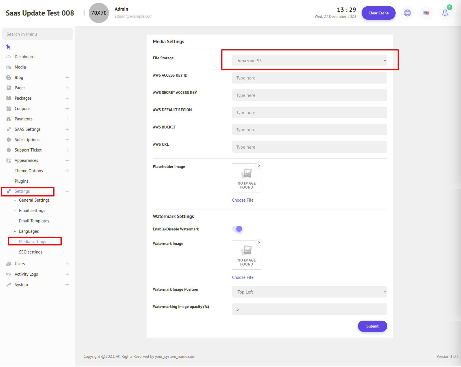 File Storage: You can select your preferred file storage from here, you can select either public or Amazon S3. If you selectAmazone S3 you have to give your AWS credentials