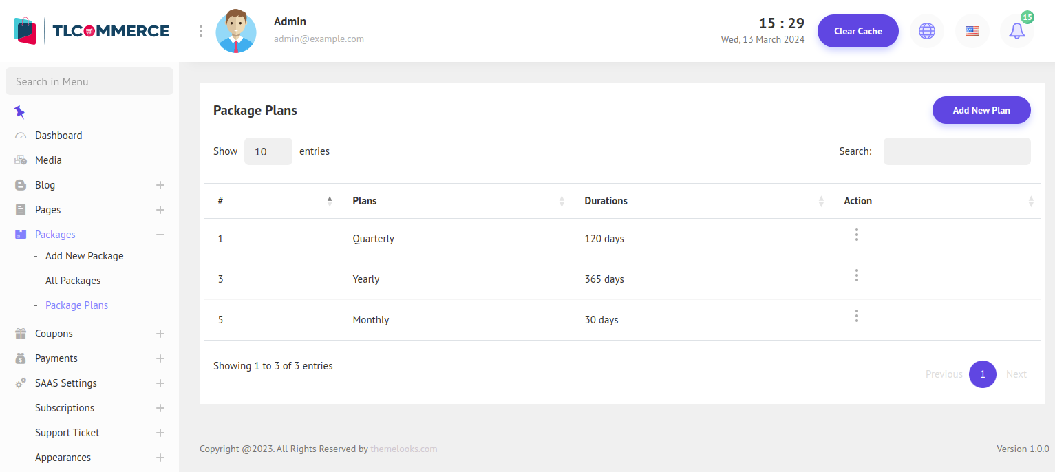 1. Click Packages > Package plans this action will redirect you to the package plans. On the top right side, you will see the "Add New Plan" button. Click on the button and fill in all the necessary details in the form, thus you can create new package plans