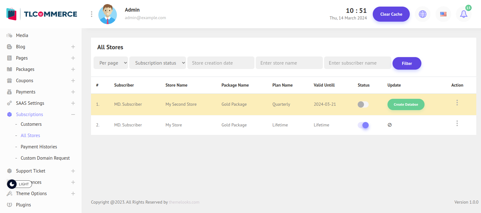 2. You will be able to see the store list. you can filter the store list by "Subscription Status", "Store Name", "Subscriber Name", and "Store Creation Date" from here.