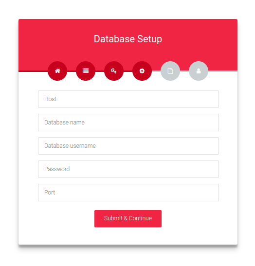 Now on the Database Setup page, you need to set DB Host, DB Name, DB Username, DB Password, and DB Port. Now click Submit & Continue.